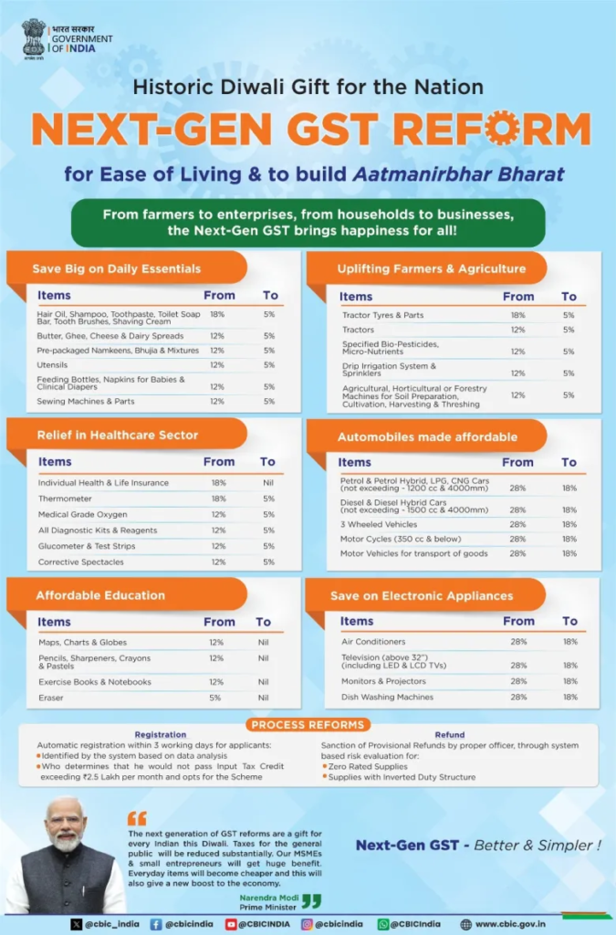 Under the new system, most goods and services will now fall under 5% or 18% slabs, making it easier for businesses and consumers to understand their tax liabilities. Essentials such as milk, medicines, and health-related products will get cheaper as they move to the 5% bracket, offering much-needed relief to households.