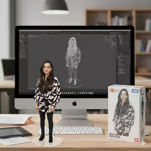“Create a 1/7 scale commercialised figurine of the characters in the picture, in a realistic style, in a real environment. The figurine is placed on a computer desk. The figurine has a round transparent acrylic base, with no text on the base. The content on the computer screen is a 3D modelling process of this figurine. Next to the computer screen sits a toy packaging box, styled like premium collectible figures and beautifully printed with original artwork..”